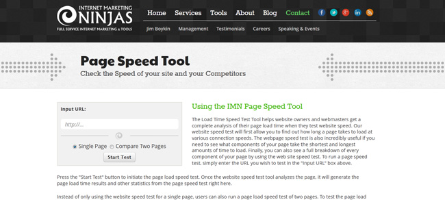 Check the speed of your site! The Internet Marketing Ninjas Page Speed tool helps website owners and webmasters get a complete analysis of their page load time. The speed test will allow you to find out how long a page takes to load at various connection speeds. You can also compare your site to one of your competitors.